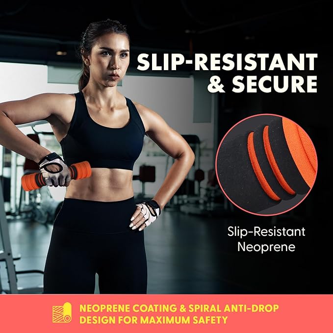 - NEOPRENE COATED DUMBBELLS: Our durable cast iron and slip resistant neoprene coating makes holding these weights easy. The dumbbells provide a gentle grip for the hands, preventing calluses. Also have a spiral Anti-Drop design that offers security