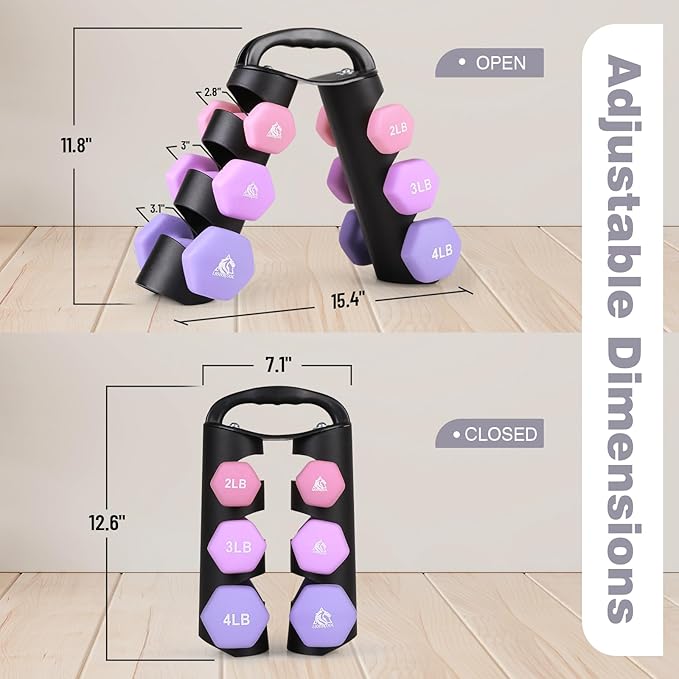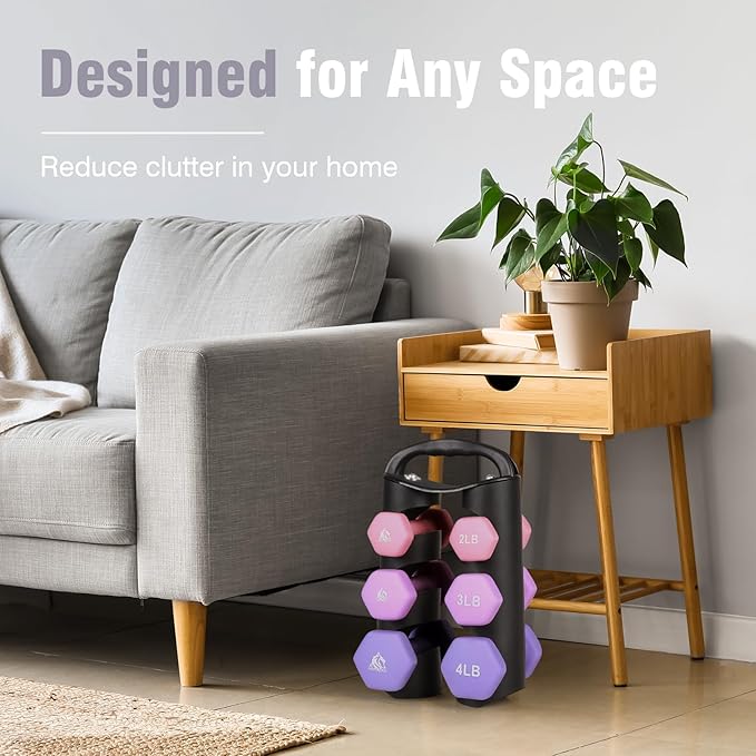 - Graceful Present for Your Friends / Family: Set includes pairs of 2lb, 3lb, 4lb neoprene coated hex dumbbells with a unique dumbbell rack for storage, which is perfect for daily workout targeting specific muscles. Light bright color and soft touching feel will please everyone. It also comes with a poster to help plan your workout.