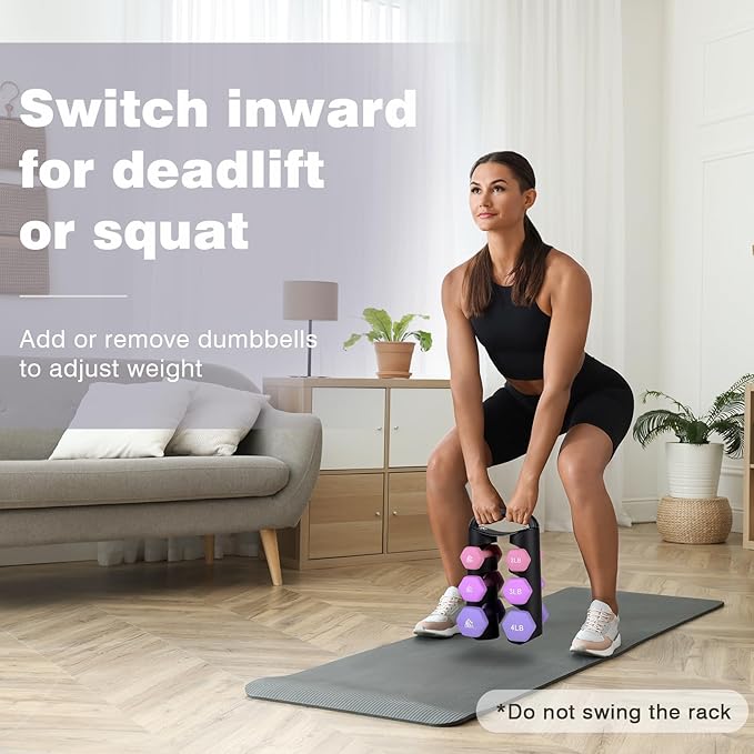 - Creative Portable Multifunctional Dumbbell Rack: No assembly needed. Innovative design for easily switch between A-frame and H-frame by rotating the rack frames. Maximize your space in H-shape and take out dumbbells easily in A-shape. You can also do kettlebell workouts with all the dumbbells on it in H-shape. Ergonomic handle for easy carrying the whole set anywhere.