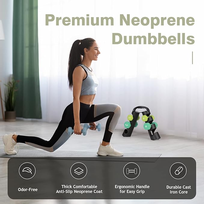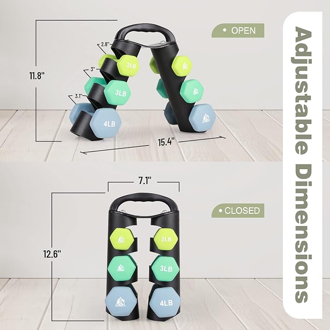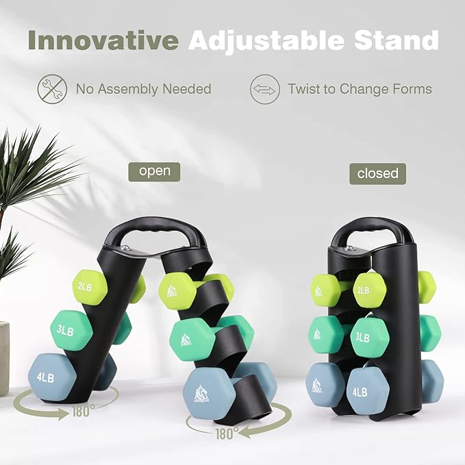 - Graceful Present for Your Friends / Family: Set includes pairs of 2lb, 3lb, 4lb neoprene coated hex dumbbells with a unique dumbbell rack for storage, which is perfect for daily workout targeting specific muscles. Light bright color and soft touching feel will please everyone. It also comes with a poster to help plan your workout.