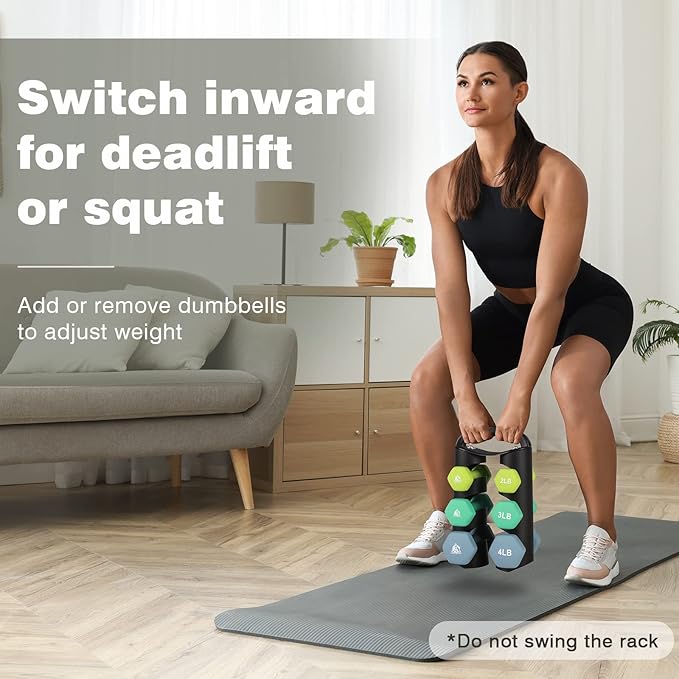 - Creative Portable Multifunctional Dumbbell Rack: No assembly needed. Innovative design for easily switch between A-frame and H-frame by rotating the rack frames. Maximize your space in H-shape and take out dumbbells easily in A-shape. You can also do kettlebell workouts with all the dumbbells on it in H-shape. Ergonomic handle for easy carrying the whole set anywhere.