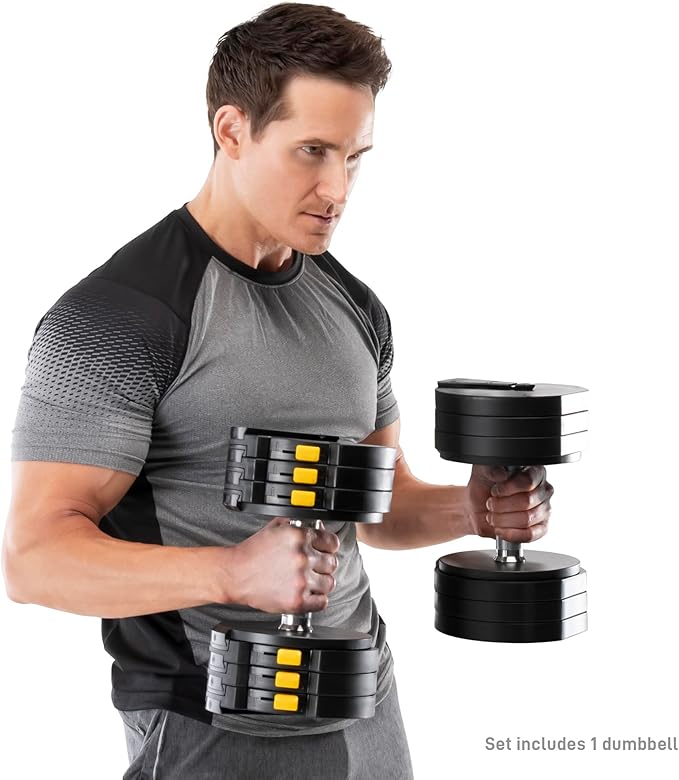 - Modify your dumbbell between 10lbs and 50lbs – 10lb / 15lb / 20lb / 30lb / 40lb / 50lb