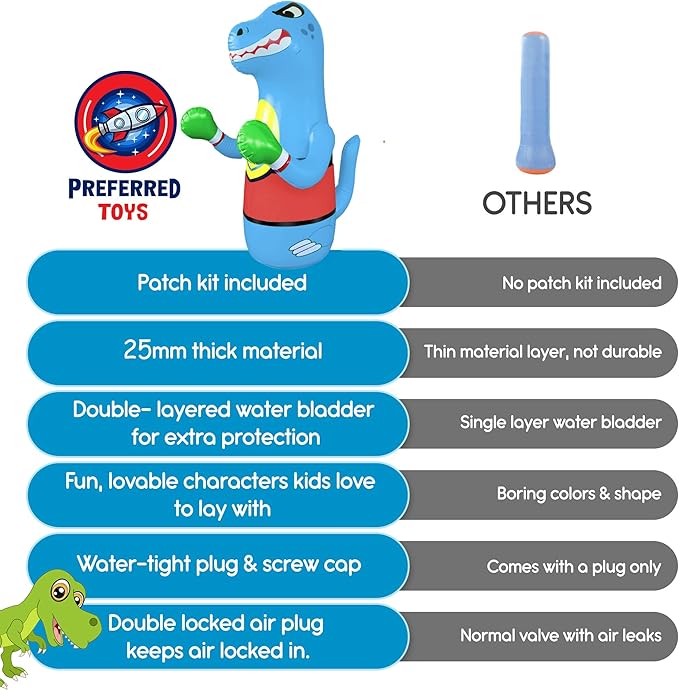 - Ultimate Boxing Bag – Our inflatable punching bag kids are ideal for 3 to 14 aged children. Playing with the punching bag kids is an excellent way for hyperactive children to release their energy. It also has a target circle in the middle of the dinosaur, which will help kids to learn how to concentrate and focus.