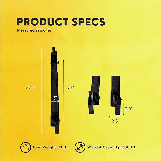 - Product Specifications - Overall Dimensions 32.25” x 3” x 5.4”. Strap Dimensions 24.75” x 2.25” x .25”. Total Weight Capacity 300 lbs.