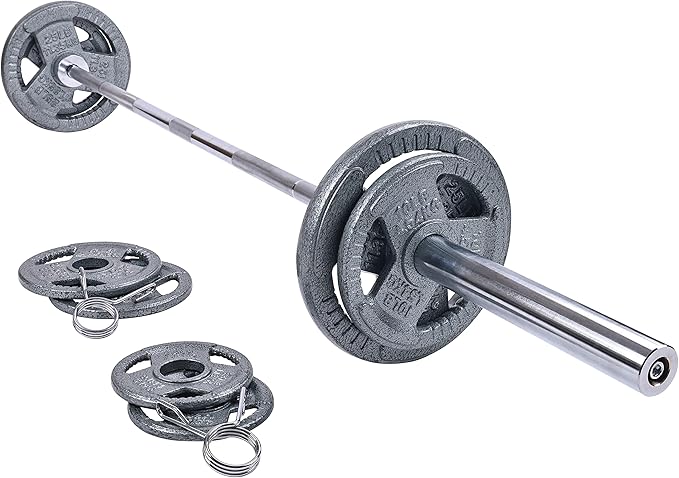 - 130 pounds set: 1x 7 feet Olympic Barbell (45 lbs), 2x 2.5lb, 2x 5lb, 2x 10lb, 2x 25lb cast iron plates