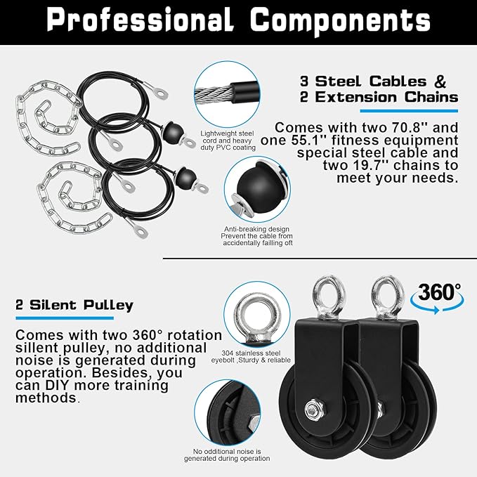 - 【Professional Components & Safe Enough】 Each attachment of our workout pulley system is carefully constructed and in good quality, which are able to withstand intense daily exercise sessions. The heavy-duty materials and solid welds keep every part secure, reducing any chance of breakage or slip-offs.