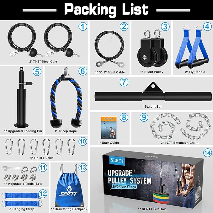 - 【Upgraded Value Kit & More Exercises Choice】 The SERTT Lat Pulley System kit has 2 pulleys and more cable machine accessories than others gym pulley system sets, allowing you to flexible DIY and choose your own way to do various exercises, such as Biceps Curl, Triceps Pull Down, Lat Pull Down, Row, Fly and etc.