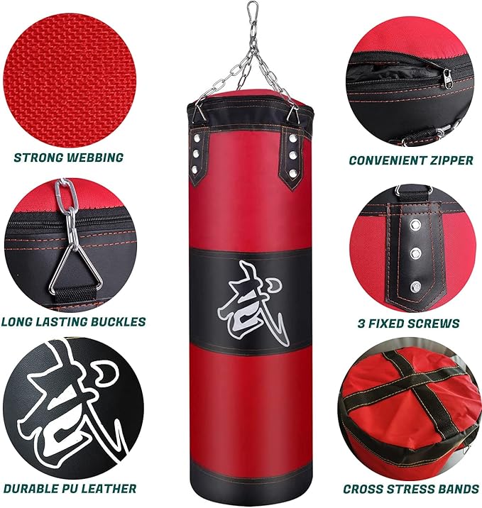 - 【WHAT YOU WILL GET】: This heavy bag set includes 1 x empty punching bag, 1 x 4-pannel steel chain, 1 x connecting carabiner, 1 x boxing bag hanger, 1 x expansion screw hook, 4 x expansion screw, 2 x Wrist band. It's the ideal choice for your family or kids to boxing and do Martial Arts, Muay Thai, Karate, Taekwondo, etc. workouts.