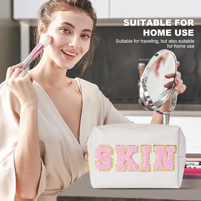 - 💄Beautiful and Elegant Design: The preppy makeup bags adopt soft white and pink color, and has a big “SKIN” letter with gold trim is stuck in the middle letter in the center. It exudes an overall sophisticated and refined look.