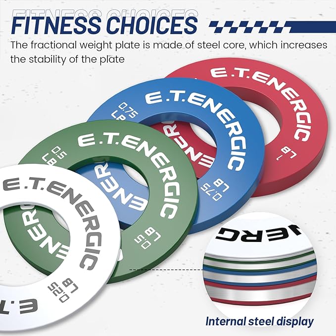 - Decimal Weight Plates: The E.T.ENERGIC Olympic Size Fractional Weight Plate Set enables the user to increase strength by 1 LB at a time. In this way, the user can continually increase the difficulty of workout. These Olympic size fractional weight plates come in increments of 0.25 lbs