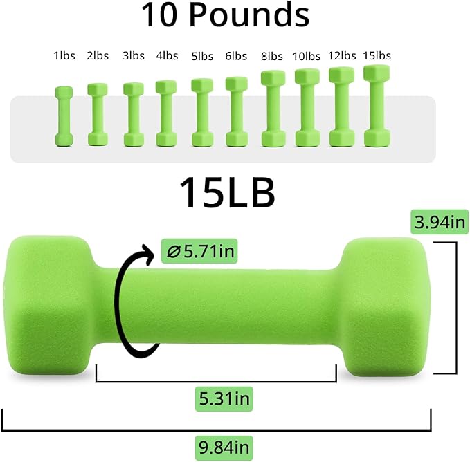 Portzon Weights Dumbbells 10 Colors Options Compatible with Set of 2 Neoprene Dumbbells Set,1-15 LB, Anti-Slip, Anti-roll, Hex Shape for Shoulder,Neck, and Hand Training for Seniors