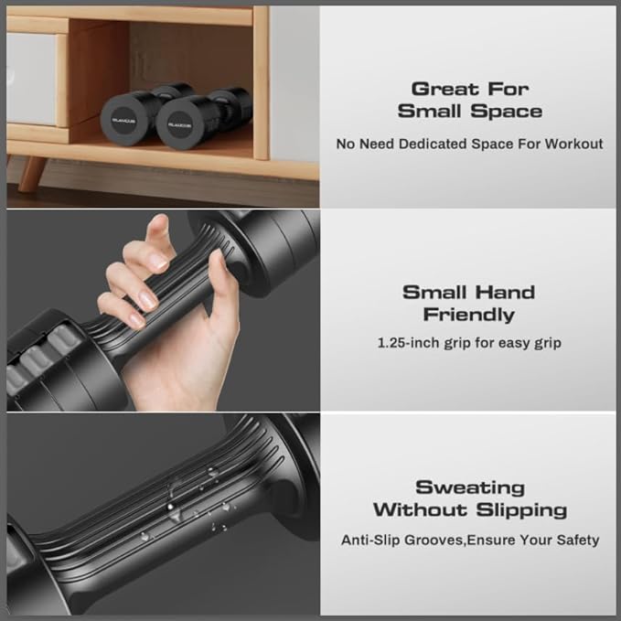 - 【DESIGN FOR COMFORT】: Comfortable Grip:The 1.25" diameter grip with non-slip grooves can be easily and correctly held by small hands. Comfortable Size:The small size of the dumbbell makes it easy to adapt to your workout routine, whether you have a dedicated workout space or not.