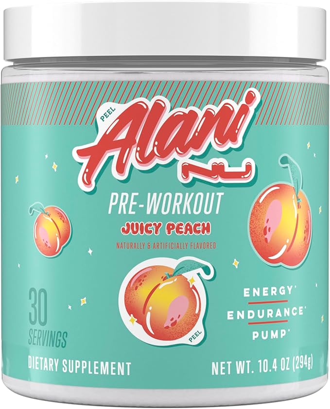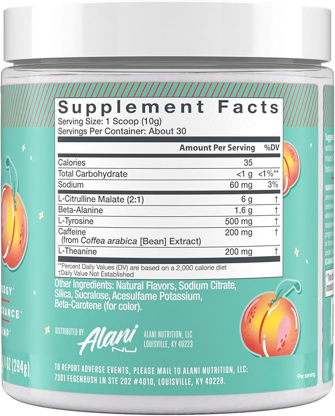 Alani Nu Pre Workout Powder Juicy Peach, Amino Energy Boost, Endurance Supplement, Sugar Free, 200mg Caffeine, L-Theanine, Beta-Alanine, Citrulline, 30 Servings