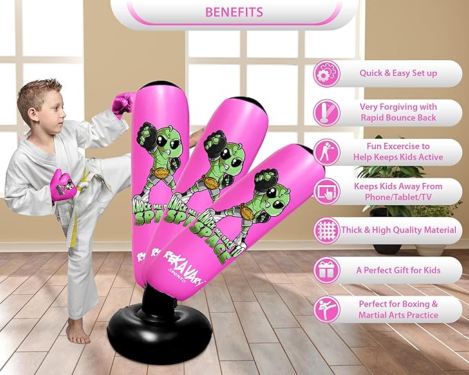 - Helps keep kids physically active - Keep your kids off the couch and glued to the tv, tablet or phone. Get them moving again and help keep them active and exercising. This inflatable kids punching boxing bag is fun, enjoyable and very responsive to get your kids exercising. Get your kids active and moving. Inflatable Ninja kids punching bag will help your kids release some energy, help them build self confidence and will help develop their power and endurance.