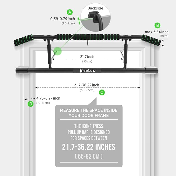 - 【Easy Installation】No screws - ready to use - no need to assemble! Simply hook right into the doorframe, get a full body workout, and fold away for storage! The pull up bar fits any standard door opening from 21.7" to 36.22" wide and 4.73" to 8.27" deep. Acceptable trim height up to 3.54"(9 cm). It holds up to 440 lbs.