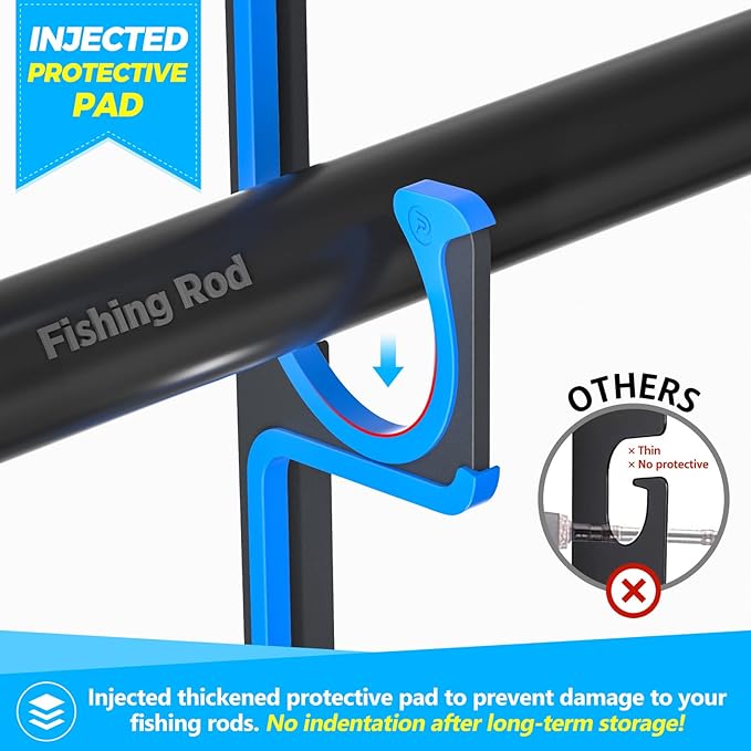 - KEY FEATURES FISHING ROD HOLDERS- PLUSINNO H5 Innovative fishing pole holders address anglers' most significant concerns - safe, organized, handy, damage-free storage of fishing rods! It Injects Protective Pad in the contact surface to prevent damage to your favorite rod! The thickened design increases the force-bearing area of the rod and rack, with no worry about indentation after long-term storage. You can easily store rods of any length or diameter out of the way for walls or ceilings!