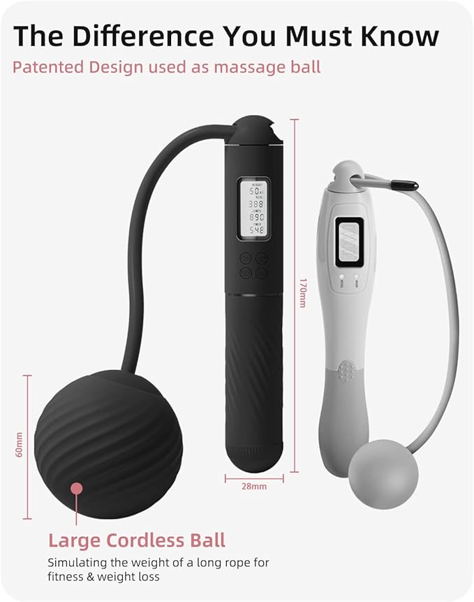 - 2.Patented 2In 1 Design for Stability: Our innovative design includes a large cordless ball that ensures the rope won't easily fall. The external thread of the ball doubles as a massage ball, simulating the weight of a long rope for fitness and weight loss. Additionally, two removable counterweights enhance fat burning and accelerate sweating.