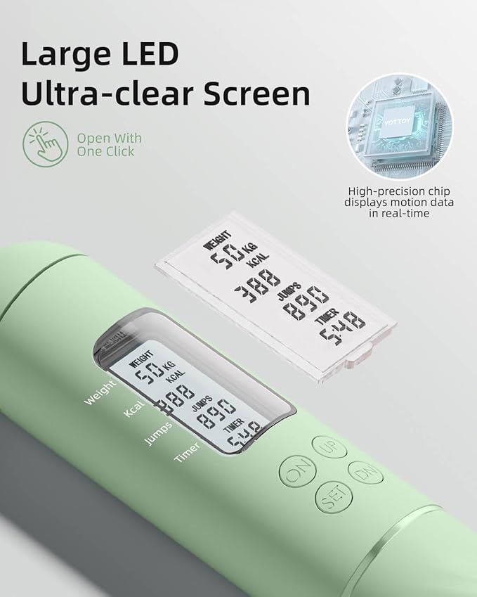 - 1.YOTTOY Jump Rope: We are dedicated to developing high-quality lightweight sports products. Our Electric Jump Rope features an HD LED display that shows the Timer, Weight, Calorie, and Circles. Set your weight and track time, number of jumps, and calories burned to achieve your fitness goals more effectively.