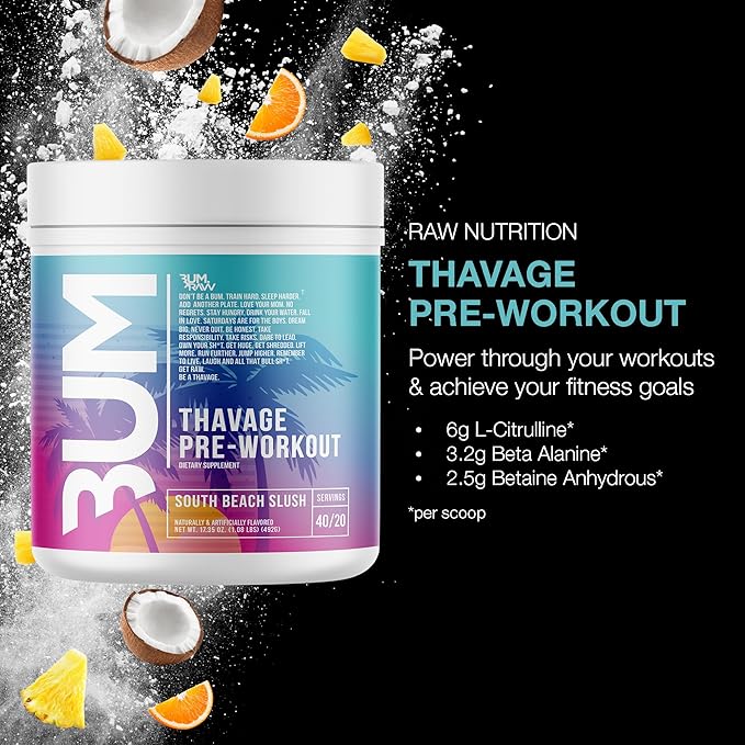 - South Beach Slush Thavage Pre-Workout: Introducing RAW Nutrition’s Thavage Pre-Workout – formulated with a blend of high-quality natural ingredients like caffeine, beta-alanine, and L-citrulline, Thavage provides a potent boost of energy and focus to help you push through even the toughest workouts. 40 servings, 18.34 oz.