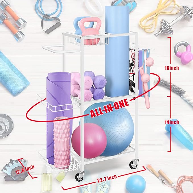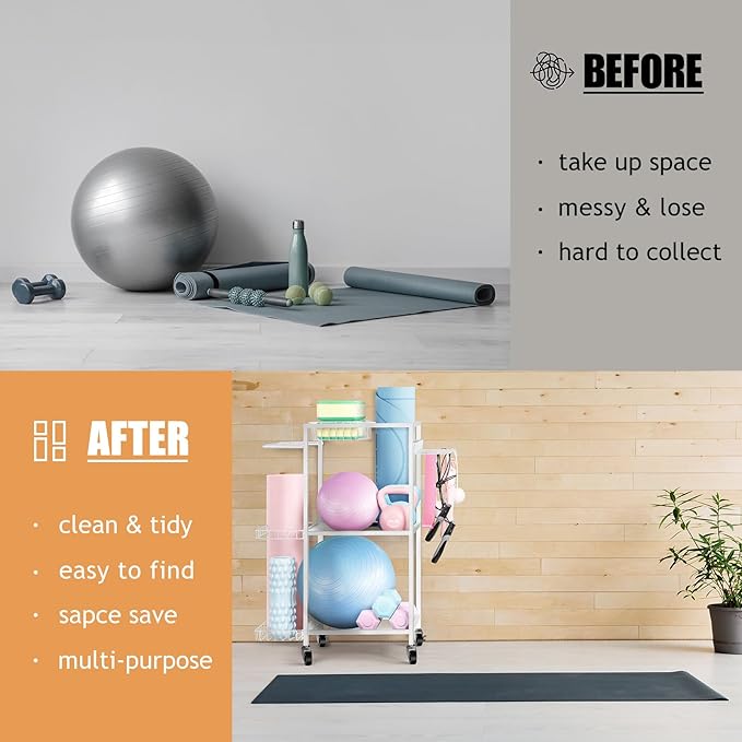 - MULTI-PURPOSE STORAGE RACK: This workout storage organizer can help to store your yoga mat, dumbbells, kettlebells, yoga brick, resistance band,roller wheel, foam roller etc. Makes your room clean and tidy, perfect for bodybuilders