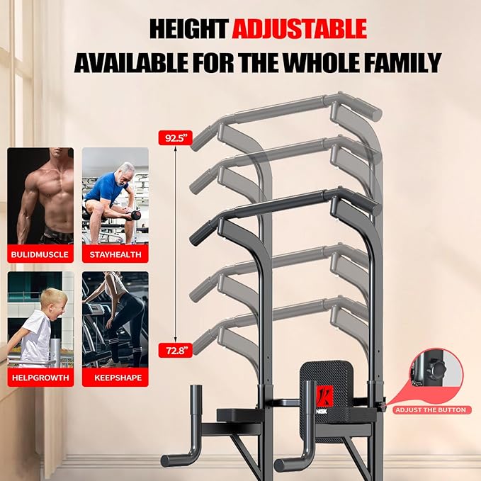 - 💪【Adjustable Height】With six levels of height adjustment, this power tower is suitable for the whole family, and the distance between holes is 3.94 inches, giving you more flexibility in your workout.