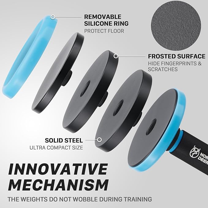 - EASY WEIGHT ADJUSTMENT: The weights are marked on each plate for quick identification. Thanks to the no-nut design, you just unscrew the plates to adjust the weight quickly. The barbell attachment also gives extra diversity in workout options.