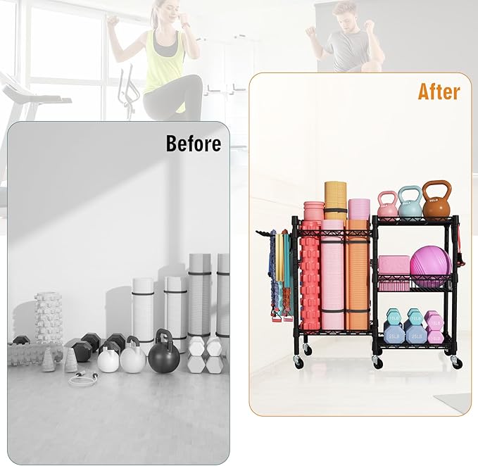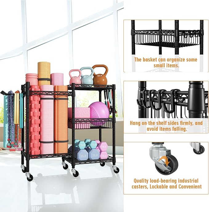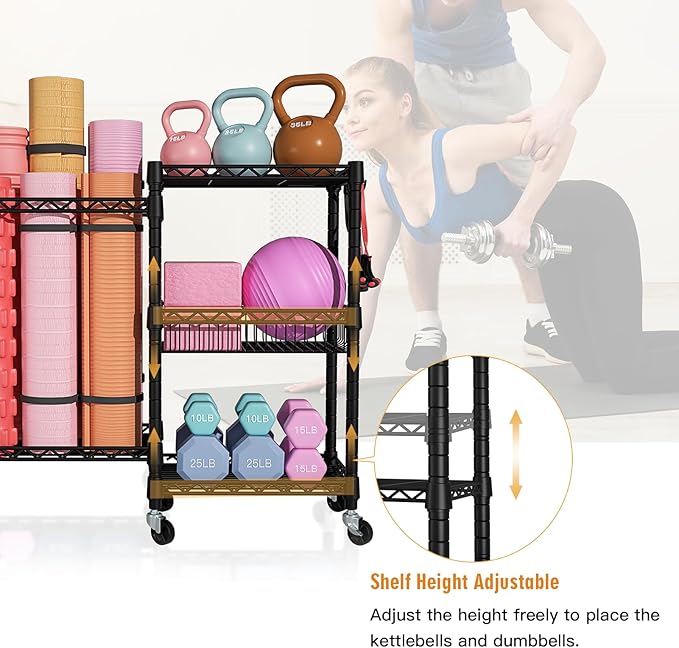 - Multiple Usage: The compact and portable home gym storage rack can be used to organize yoga mats, foam rollers, yoga bolsters, yoga balls and blocks, dumbbells, kettlebells, resistance bands, yoga straps, jump ropes, yoga wheels, hula hoops and more. Meanwhile, the storage rack can be placed on your door entry, it can use to place shoes, umbrellas, and other items
