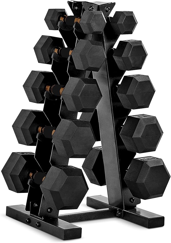 - SPACE-SAVING DESIGN – The A-frame design of this rack maximizes floor space by storing dumbbells in an “A” shape, or vertical fashion. Easily access and store dumbbells. Rubber inserts prevent dumbbells and rack from scratches