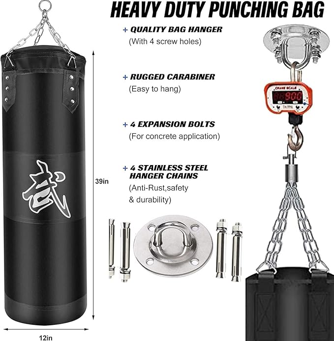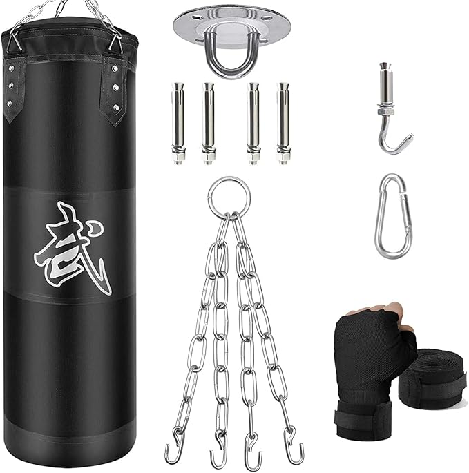 - 【WHAT YOU WILL GET】: This punching bag set includes 1 x 100cm empty punching bag, 1 x 4-pannel steel chain, 1 x connecting carabiner, 1 x boxing bag hanger, 1 x expansion screw hook, 4 x expansion screw, 2 x Wrist band. It's the ideal choice for your family or kids to boxing and do Martial Arts, Muay Thai, Karate, Taekwondo, etc. workouts