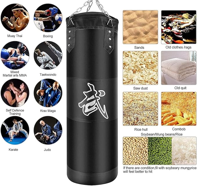 - 【 EASY TO FILL 】: Heavy punching bag is empty, easy to carry and storage. You can fill it up with sawdust, sand, old cloth, shredded cotton fabric, sponge and more. But please don’t only install sand, the filling preferably no more than 50 pounds
