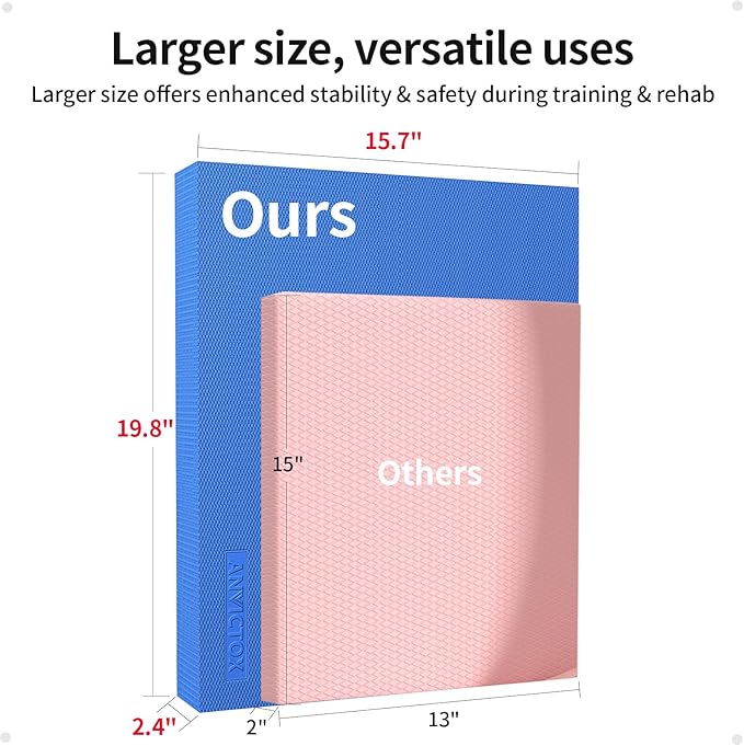 - [Larger Size&Versatile Use]19.8*15.7*2.4inch.Larger balance pads provide a larger support area, making people more stable and safe during training or rehabilitation. It can also better train body muscle control and balance, enhancing body stability and coordination. Large balance pad usually has better anti-slip performance, offering better support and protection. They are suitable for users of different heights and body types, better meeting their needs