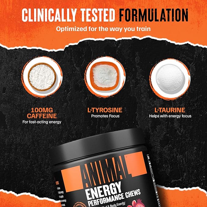 - Chewable Energy On Demand – Designed to fuel your day, Animal Energy Chews let you choose your boost. Take 2 for a quick pick-me-up, 4 for steady energy, or 6 for a pre workout surge to support high-intensity training and busy schedules