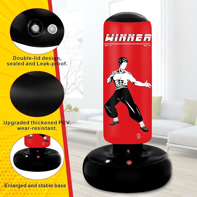 - THICKENED MATERIAL: The punching bag for kids is made of PVC, and we pick 0.45 MM thickened material to make it more durable.After a long time of hitting, it can also keep the surface smooth, no cracking, no leakage.The upgraded air valve is better sealed and can hold air for a long time to prevent leaks