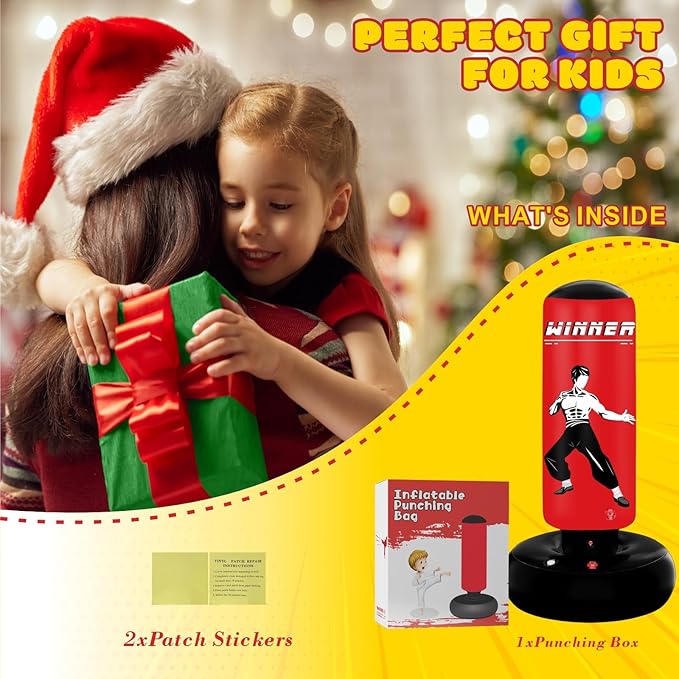 - COMPLETE ACCESSORIES: Includes 2 patch convenient use. A preferred gift for children to expend energy, step away from screens, relieve stress, and improve coordination—everything you need to create joyful moments with our boxing punching bag