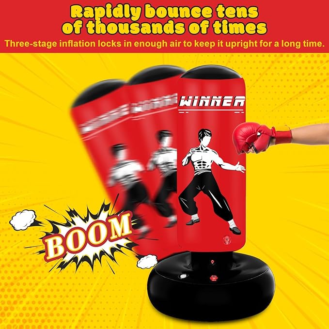 - EASY SETUP: Kids Punching bag designed for easy assembly, storage, and portability.Allows your child to enjoy sports indoors and outdoors without restrictions. Add 5-6 gallons of water to the base for enhanced stability,no matter how forcefully your kids punch or kick the inflatable punching bag, it will immediately rebound