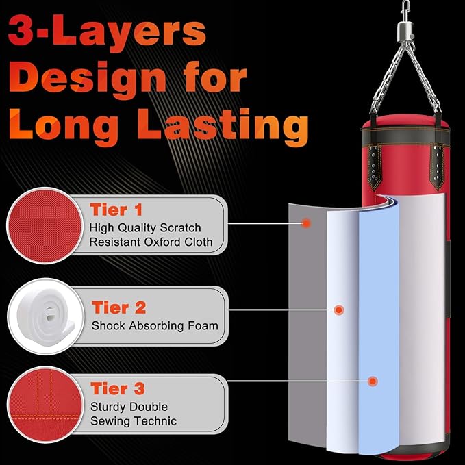 - 【High-density Oxford Fabric Material】Punching bag with multi-layer structure design: the surface layer is made of wear-resistant thick Oxford cloth, high-rebound shock-absorbing pearl cotton interlayer, nylon liner, bottom cross-reinforced tear-resistant, durable, giving you more Professional boxing experience.