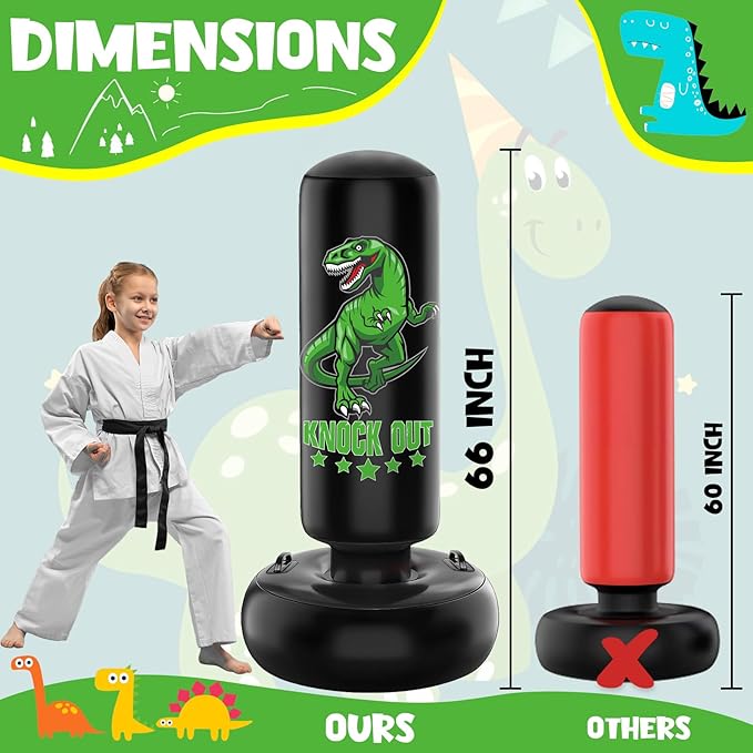 Larger Stable Dinosaur Punching Bag for Kids, 66" Tall Sports Kids Teens Inflatable Punching Bag with Boxing Gloves, Gifts for Boys & Girls Age 5-12 for Practicing Karate, Taekwondo, MMA