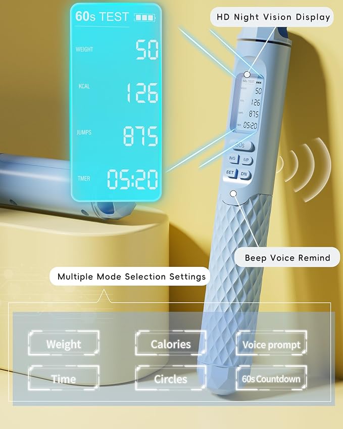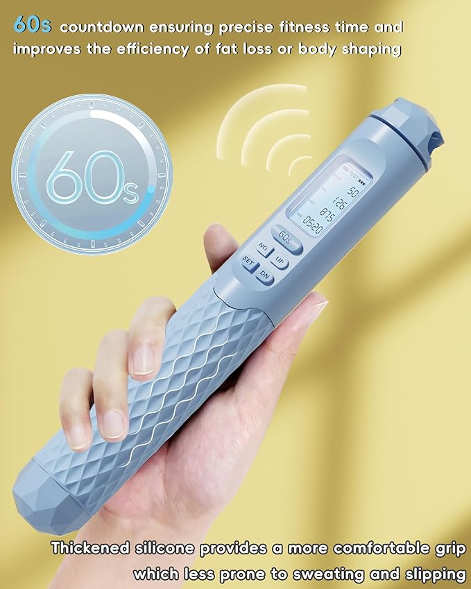 - 💡【60S Countdown】I know it’s easy to lose track of time when you’re immersed in skipping. It’s okay, we’ll remind you, see that “60S” button? Just press it and it will automatically enter the countdown to remind you that 1 min is up. So how many times can you jump in 1 min? Let's try to push the limits