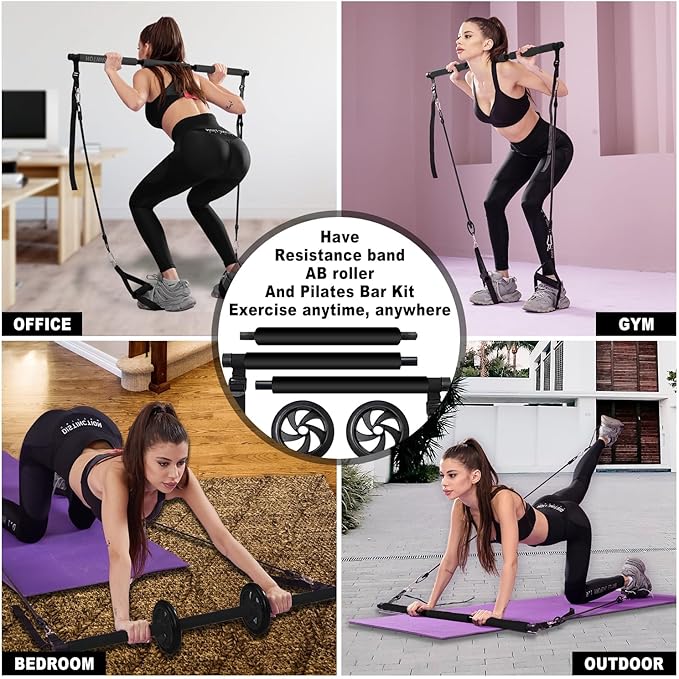 Ultimate Pilates bar kit.Multiple Fitness bar with Resistance Bands, Ab Rollers. Core Strength Training Equipment. Squat Machine for Men and Women. Portable Home Gym