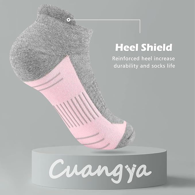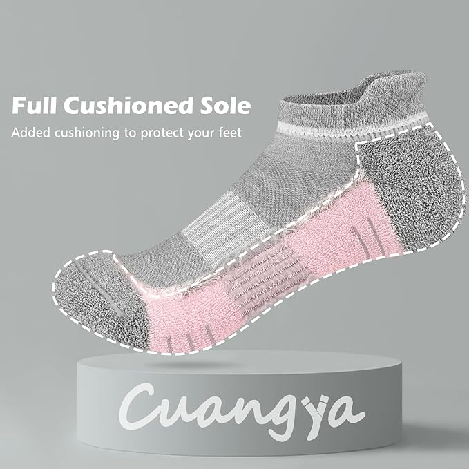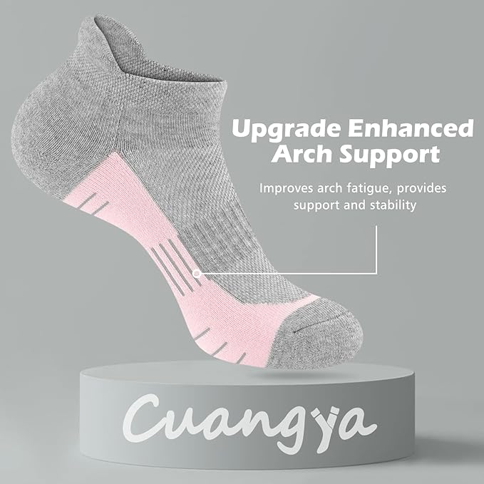 - Cushioned Ankle Socks - No show cushioned socks keep feet comfortable and relaxed, absorb impact, relieve foot fatigue, and ensure no blisters after long hours of wear. Compressive arch support gives the runner a stable and secure arch support, reducing fascial fatigue during running.