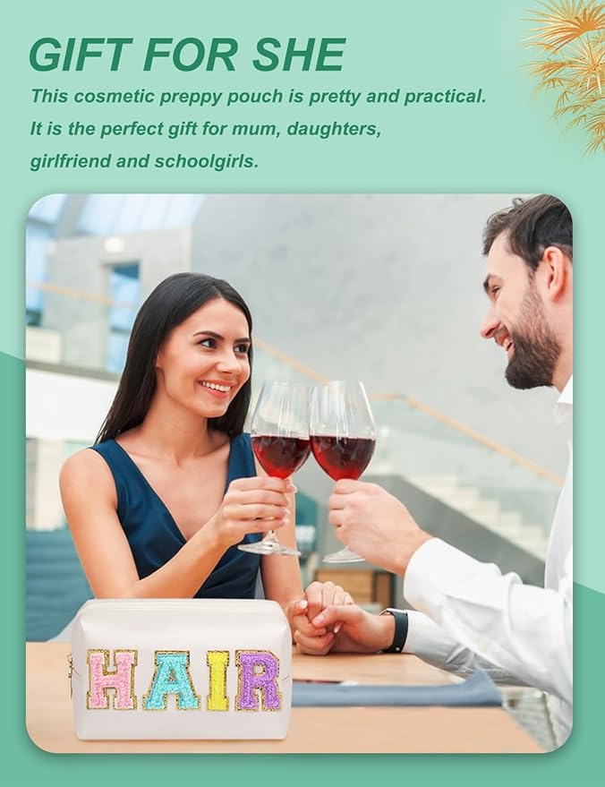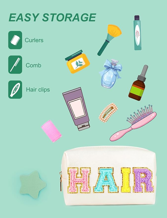 - ★GLITTER LETTER DESIGN - The patch makeup bag features vibrant "HAIR" chenille letters with gold trim on one side, securely sewn onto the bag for long-lasting appeal
