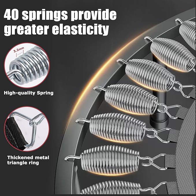 - 【450 LBS Heavy-Duty Spring Rebounder - Adults & Kids Safe】Engineered with 40 high-tension springs (not bungee cords!), this professional rebounder trampoline for adults supports up to 450 lbs – 35% higher than average. The spring system absorbs impact 3x better for joint-safe cardio, whether you're doing HIIT workouts or kids are bouncing after school.