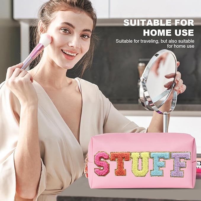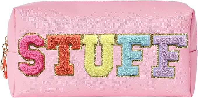 Preppy Patch Stuff Portable Makeup Bag Bulk Pu Leather Cosmetic Bag Waterproof Travel Organizer Zipper Pouch Storage Purse for Women Girls Gift (HZB-FS-CS-STUFF)