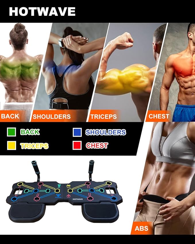 - 【ULTIMATE HOME WORKOUT EQUIPMENT】The newly upgraded hotwave portable fitness device is more efficient and stable. You can freely assemble accessories to complete the training:foldable Pushup board&Plank,Unique 3-section Bar,4 Strong resistance bands, 2Ankle Strap,door nachor,Ab roller wheel,Can complete more than 50 different exercises,Help you exercise whenever you want,just like at the gym.