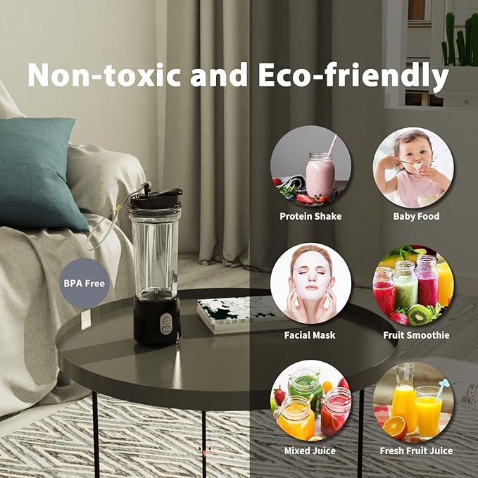 - 【Easy to Charge and Portable】The portable USB blender comes with a built-in 2x2000mAh rechargeable battery that works with all USB ports, including cellphones, computers, laptops and other USB devices. It is compact and portable enough to put in your backpack when traveling. Suitable for indoor and outdoor activities, travel, work, everything with you!
