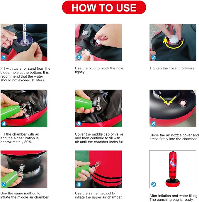 - 1, the new design puts the double water part on the base, which is very convenient to add water or sand,2, the middle connection position is thick, and the rebound speed is faster and more stable when boxing. 3, the inflation port all use double cover air nozzle, the speed of inflation and discharge is very fast.