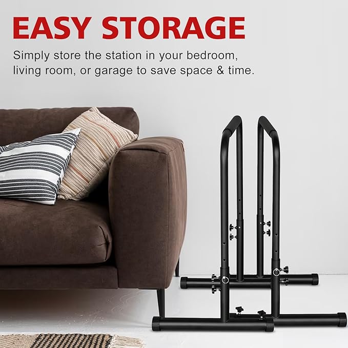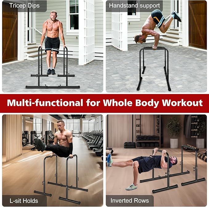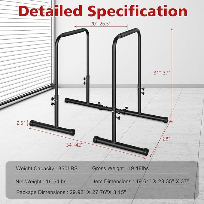 - 【Sturdy Construction】Our heavy duty steel construction Dip stands is made of high-quality steel pipes, which has 350LBS weight capacity and double safety connector. Non-slip and wear-resistant rubber feet for firm positioning to keep you safe, prevent slipping and wobbling while preventing damage to the floor.