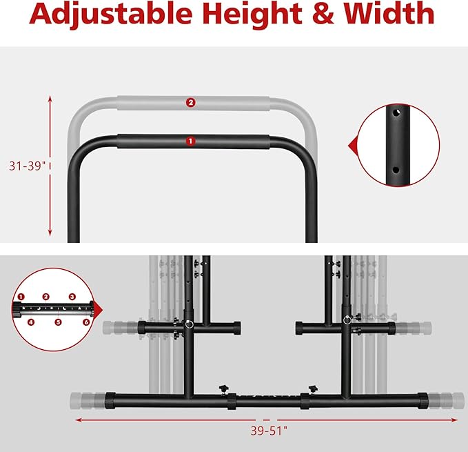 - 【Adjustable Height and Width】LSKSSNG adjustable dip station, width is 39''- 51'' inch, Height is 31''- 39'' inch. You can easily set up different workouts to do to maintain or improve health and fitness, you can adjust it To suit your needs for a variety of sports.