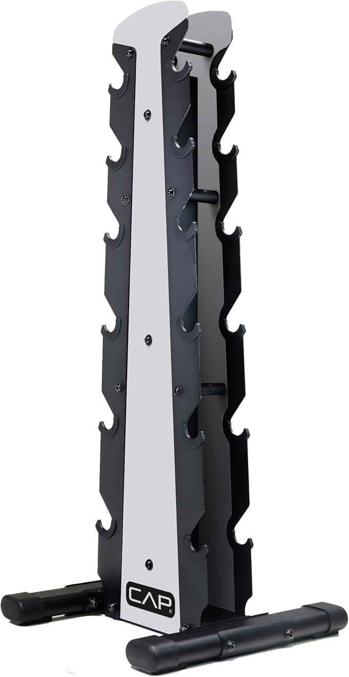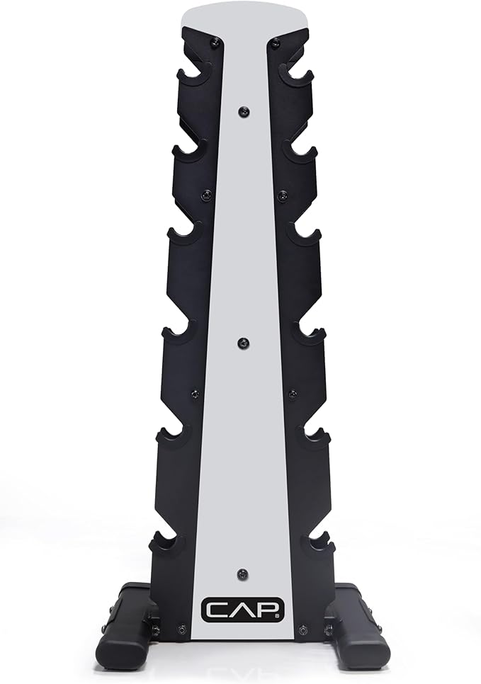 - Holds 210 pounds - Designed to hold 6 pairs of CAP Bbarbell hex or rubber hex dumbbells ranging from 5 to 30 pounds; Mix and match your dumbbells to fit this rack, up to 35 pounds pairs; Some combinations may not fit