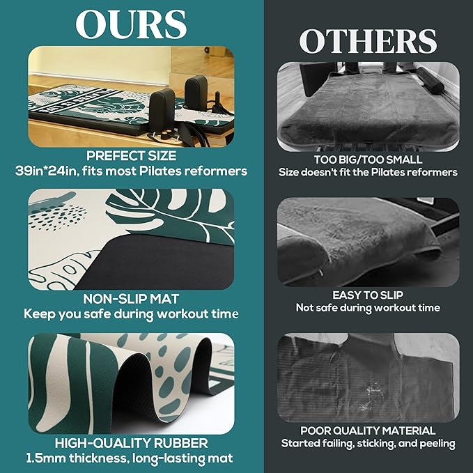 - NON-SLIP RUBBER BOTTOM: The bottom of our Pilates mat for reformer is covered by a layer of anti-slip coating, which is long-lasting, non-toxic, and invisible. The anti-slip coating agent increases the grip between the Pilates reformer mat and the surface, giving you a safer experience when using a home Pilates reformer or gym Pilates reformer.